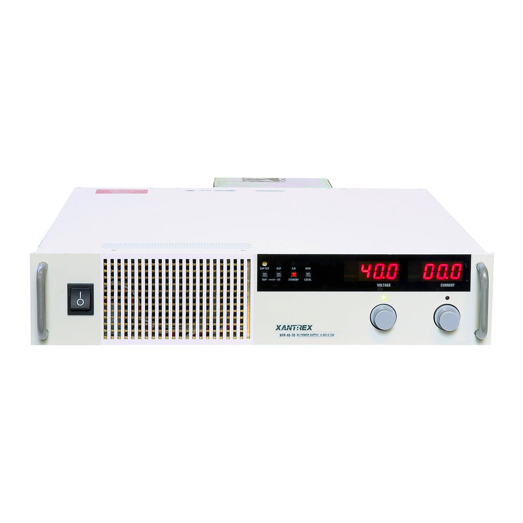 The XFR40-70 power supply provides low-noise, precisely regulated, variable DC output at 2800 Watts of output power. Overvoltage protection (OVP) and thermal shutdown are standard. Front panel controls and indicators are extensive.